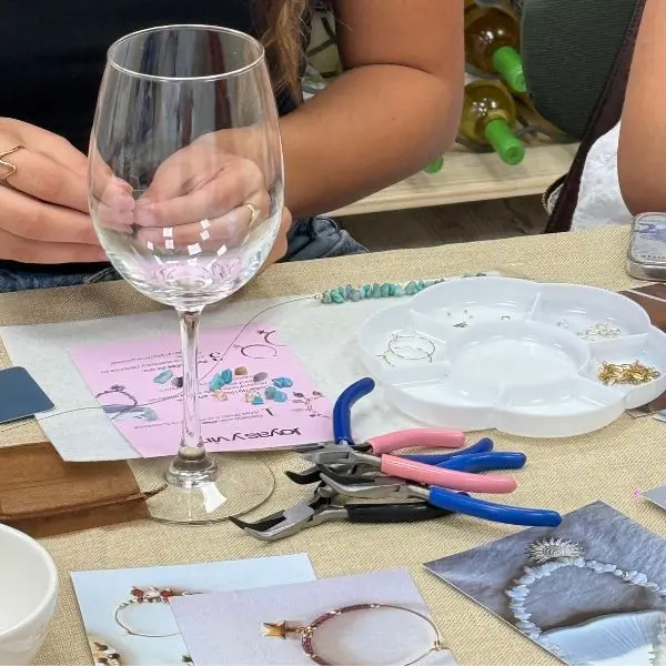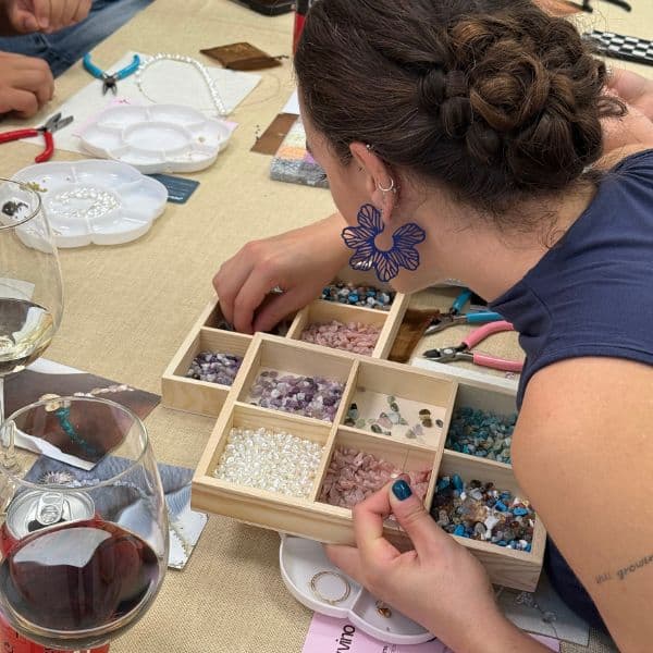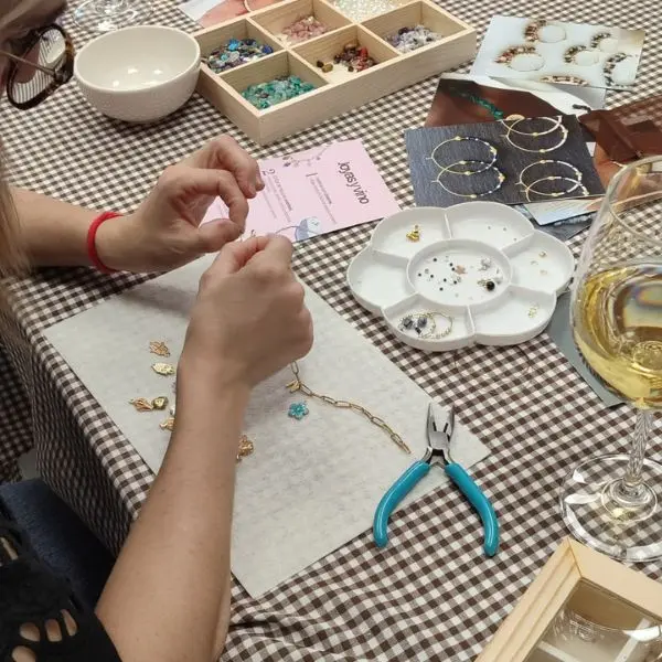 Ponemos a tu disposición todas las herramientas profesionales (alicates, cadenas, etc.) y una gran selección de materiales: piedras naturales, abalorios de colores y charms variados.
